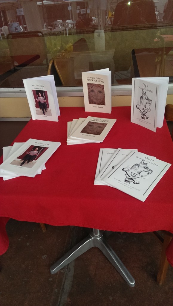 And of course, having a blog, obviously, that is useful, to show your work, your words, to other people. So here I am, talking about my previous books, my current book-in-progress, and the one that may come after the current book. I’ve written about a number of different things. In the photo above we have “Mick Jane and Me”, which is a memoir talking about my life with Multiple Sclerosis. And “Precious Gems” is there too, a poetry collection about child sexual abuse, and other abuse too. And then, for something completely different, is “Dig It!”, an amusing little book with illustrations I created with my clever friend Ally Hean who did the pictures.