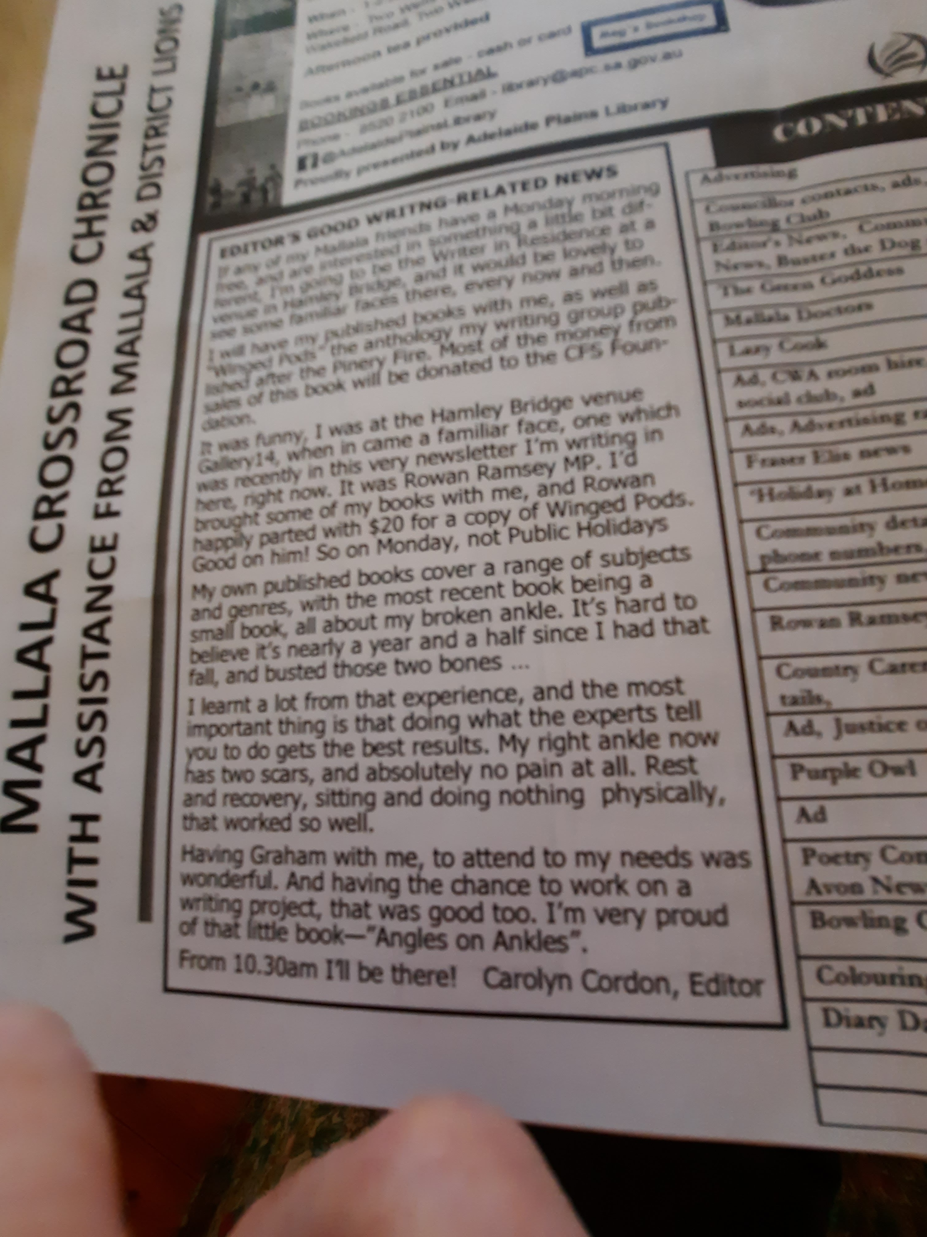 So that’s one way. But the way I am currently working on my next big novel project is happening in a different way. I am writing a novel in a particular genre (Cosy Murder Mystery), and I am using prompts given at my writing group, to get some of the novel written. I have setting and characters, and with one third of the novel written so far, I have a fair idea on what is going on, and needs to go on in this first novel in my “At Talloola” Cosy Murder Mystery series.