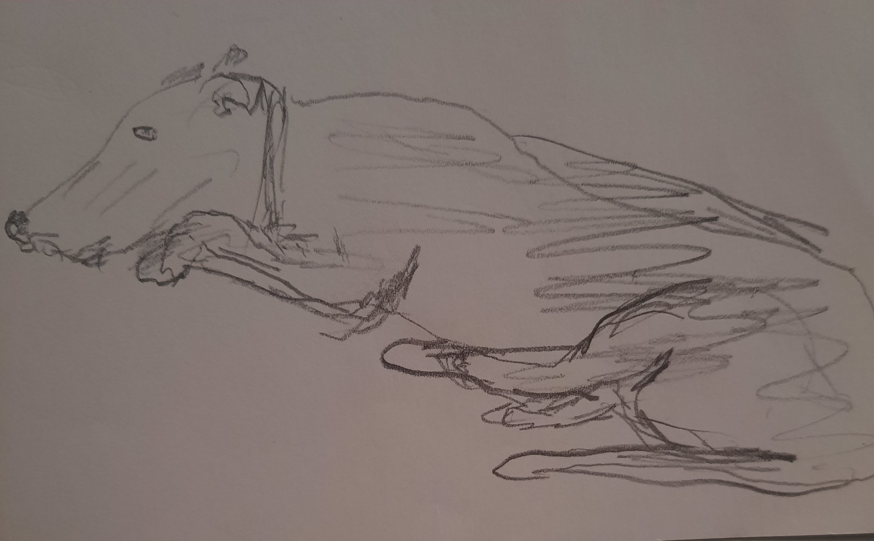 Then there’s the dog who needs to be let out, and then let back in again, from time to time, and to feed as well of course. And I drew another picture of that dog, and while it isn’t the best picture of a dog ever done, you can at least look at it and think, hmm, yes unquestionally that is a dog, at dog that is lying down somewhere.